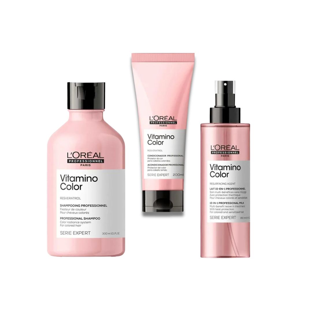 Apresentamos o Kit Completo L’Oréal Professionnel Vitamino Color, o sistema profissional de cuidado para cabelos coloridos mais amado do mundo. Composto por Shampoo, Condicionador e o icônico Spray Leave-in 10-in-1, este kit utiliza o poder do Resveratrol para fixar a cor e combater o desbotamento.